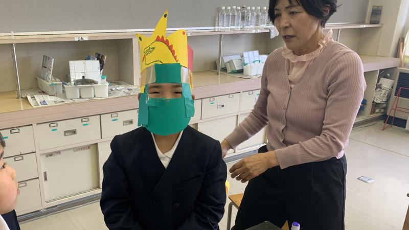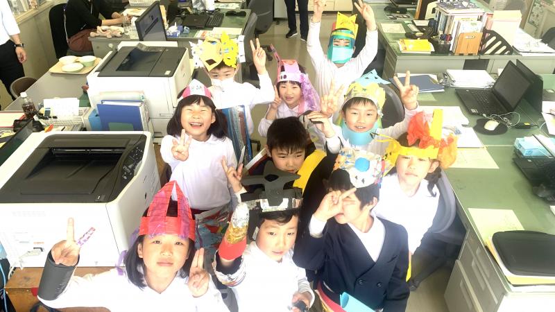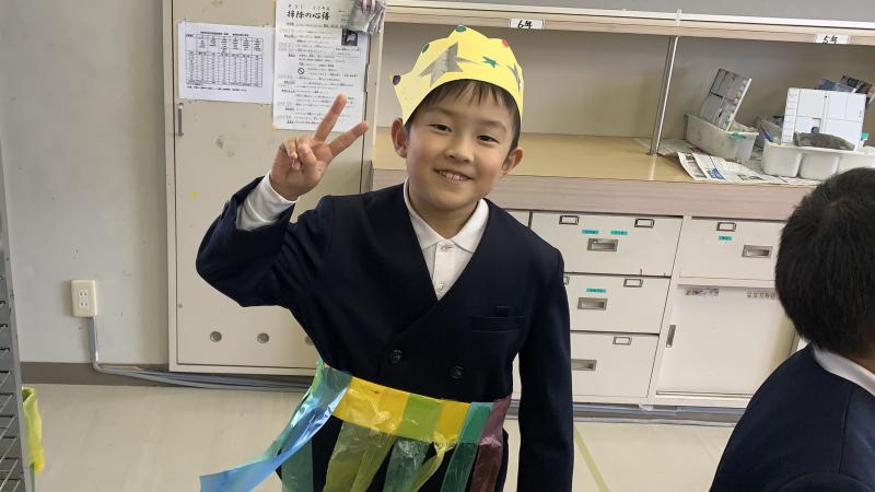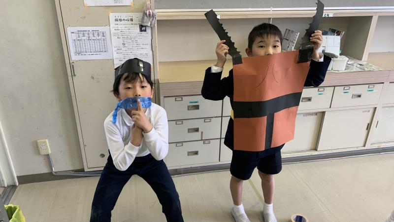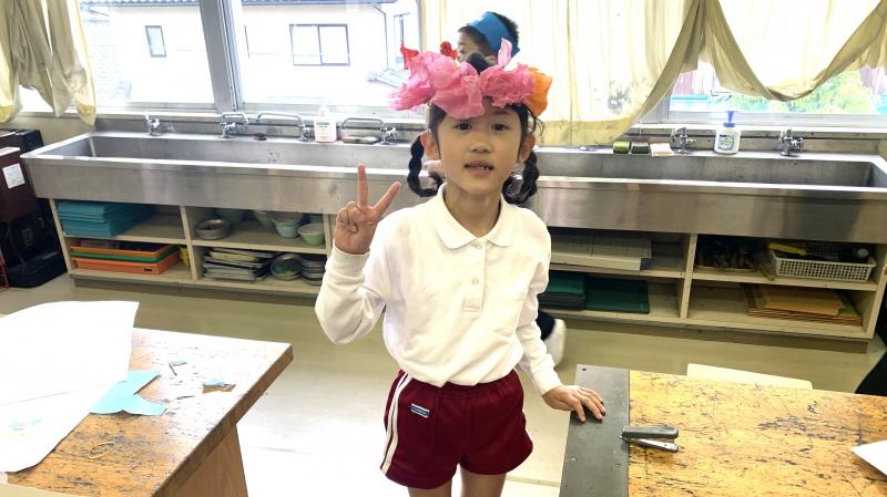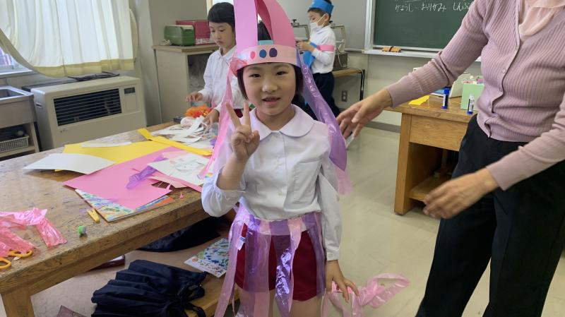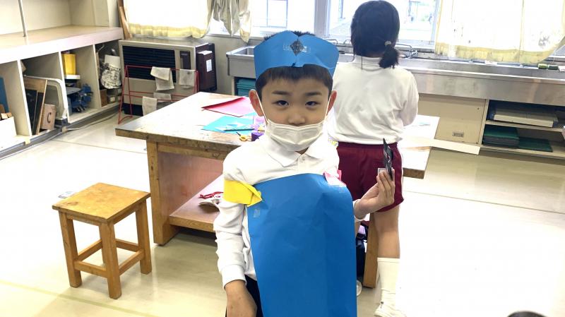 2年生の図工です。紙でわっかをつくり、そこに思い思いの飾りをつけて楽しみました。皆、自分のつくった「わっか」を頭や腰につけて大満足の様子です。「わっか」からお面や、体につける大きな飾りをつくった子もいます。写真に納まるポーズも、決まっていますね!