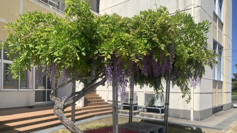 お天気の良い日は、外で鉄棒をする時があります。頭と足が逆さまになる瞬間が楽しいようです。藤の花は綺麗な姿を保っています。花の下で座るのはとても気持ちよさようです。三枚目は、2年図工「わっかで変身!」。全員の作品が完成し、職員室まで見せにきてくれました。とても満足気でした。