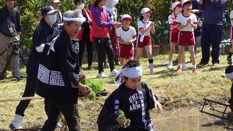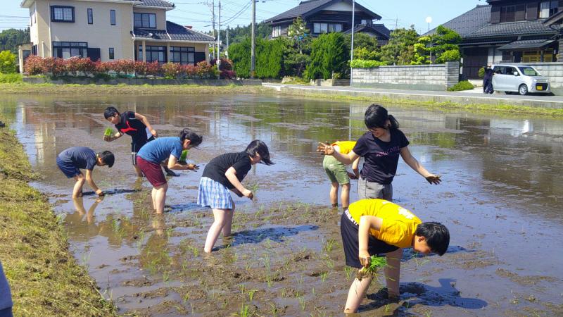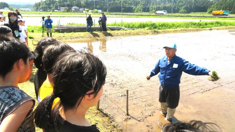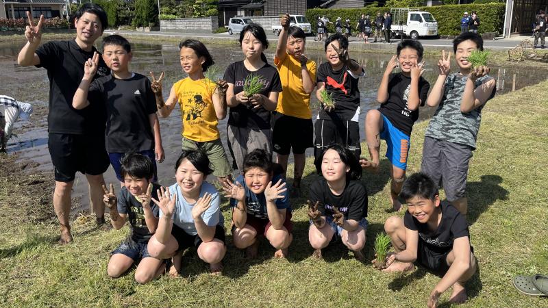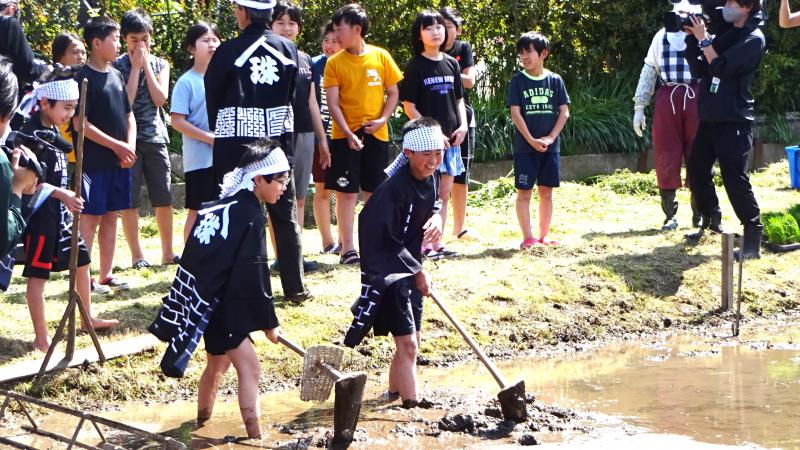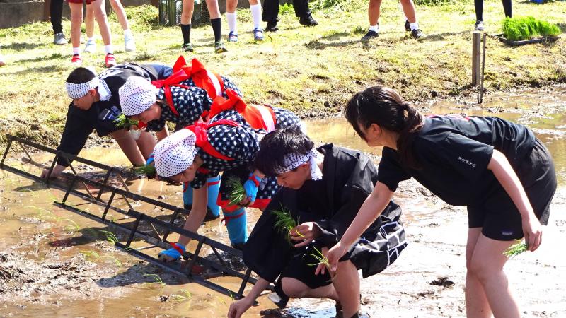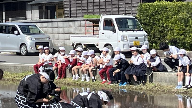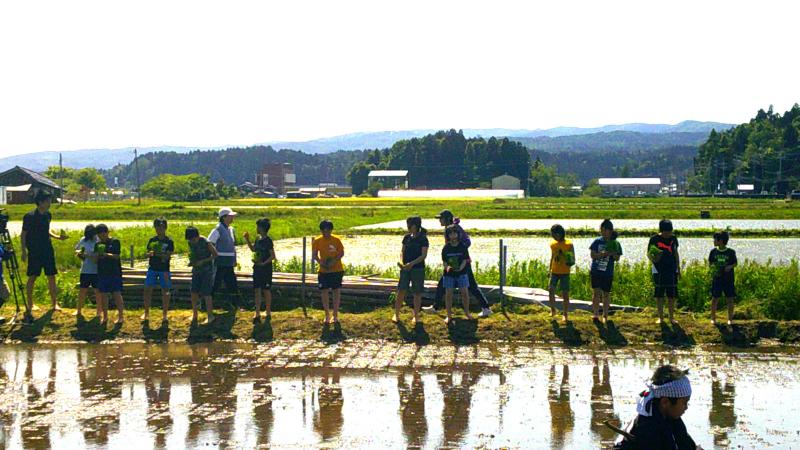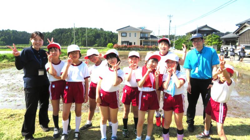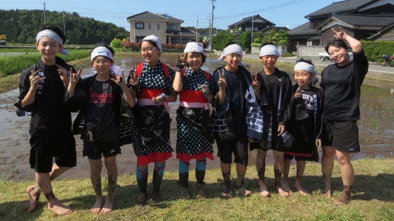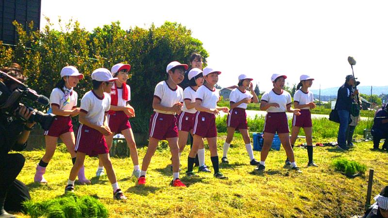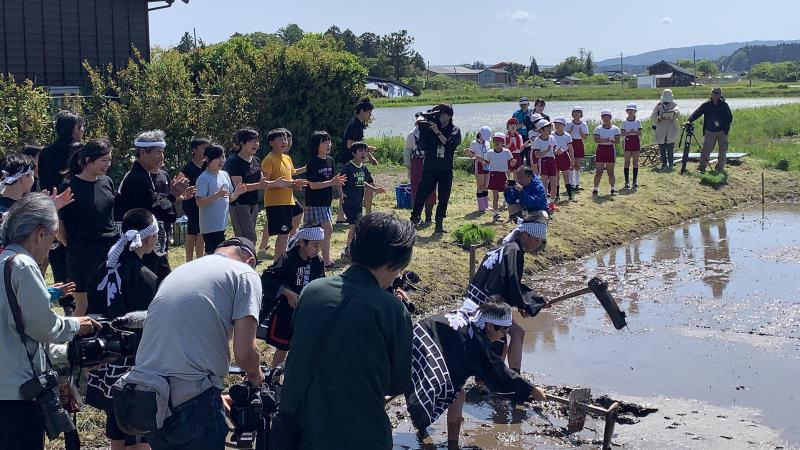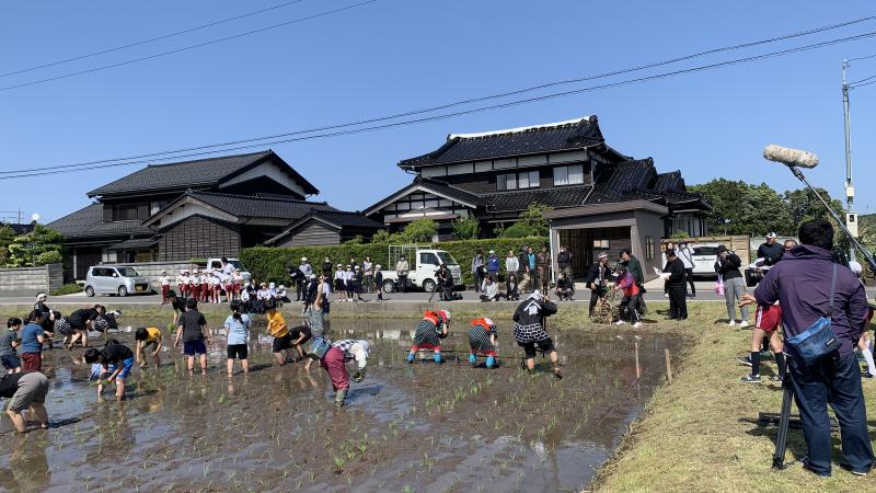 本日は、絶好の田植日和、唄日和でした!沢山の報道関係者に囲まれて、4年生の田植え唄、5年生の田打ち唄&田植え、6年生は、衣装(法被姿、早乙女姿)を着けての田植えを行うことが出来ました。1~3年生も応援にきてくれ、子供達は、とっても張り切っていました。これもJAのと様、きずな様、珠洲民謡研究会をはじめ、関係各位のご尽力のおかげです。本当にありがとうございました。