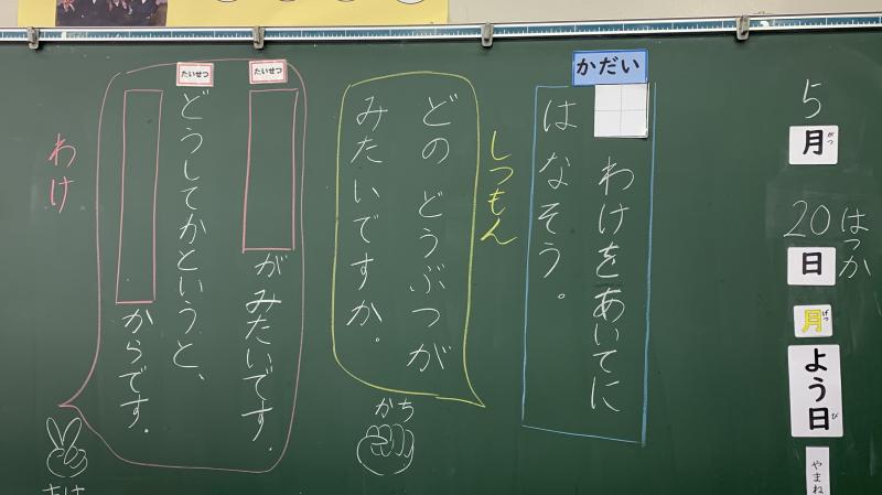 1年生の国語で「わけを相手に話そう」という学習をしていました。自分の意見や考えについて、その根拠となる理由を話すことは、これからの授業においても、とても大事な勉強です。1年生は、皆上手に見たい動物のわけを話していました。これからも楽しみです。