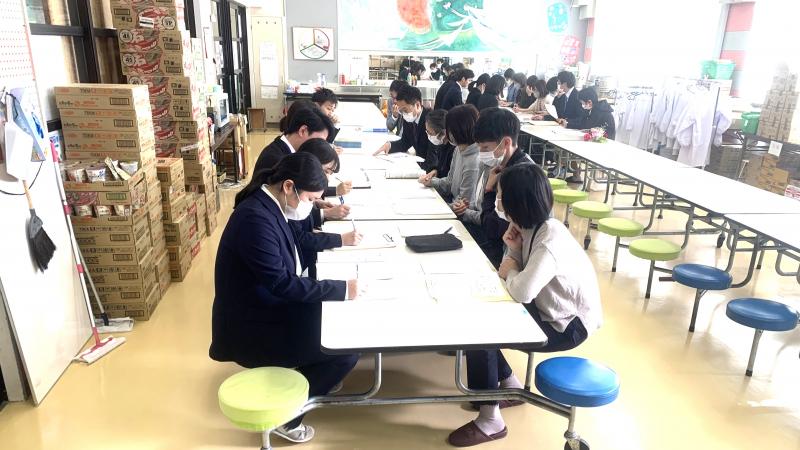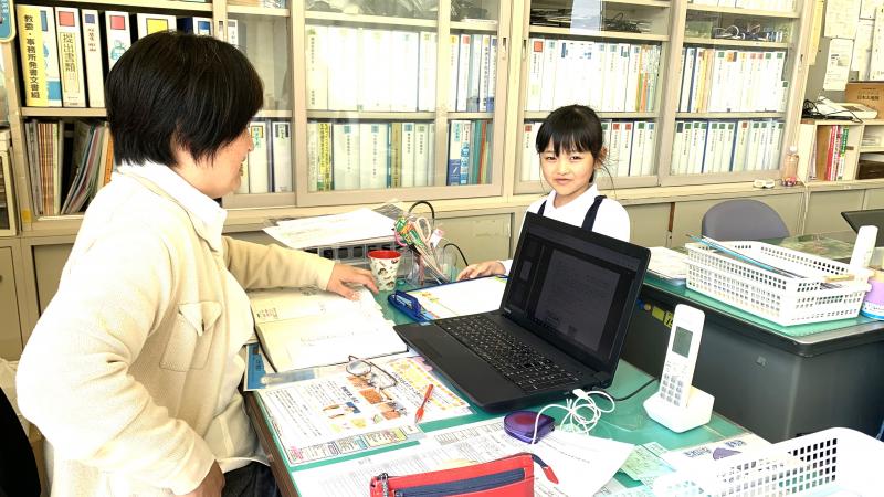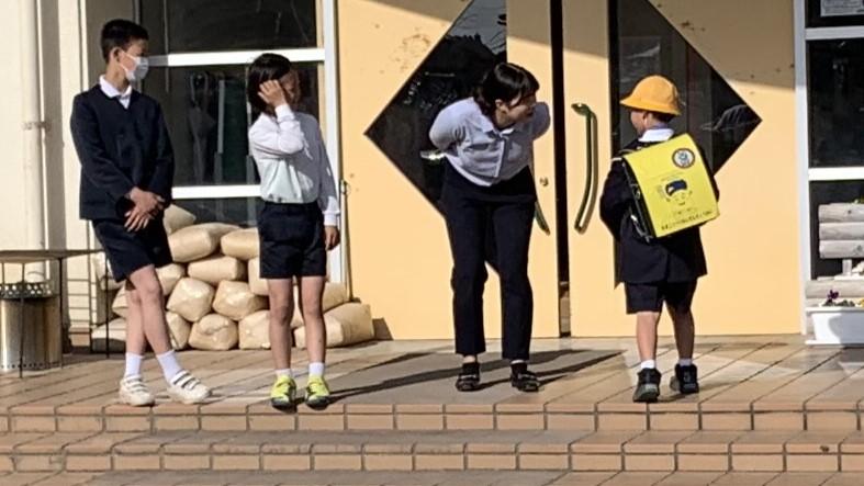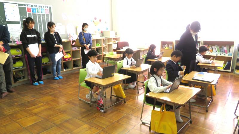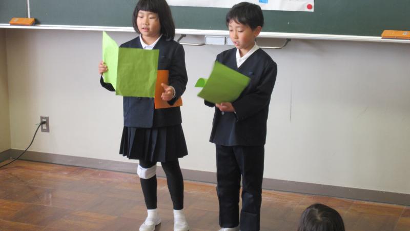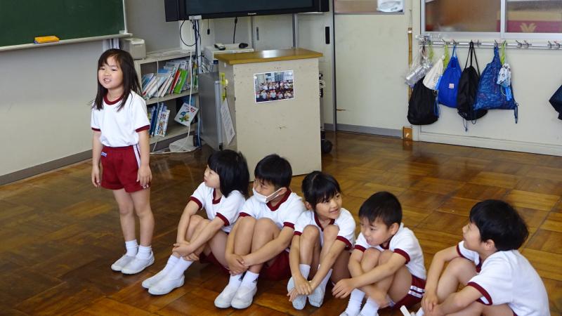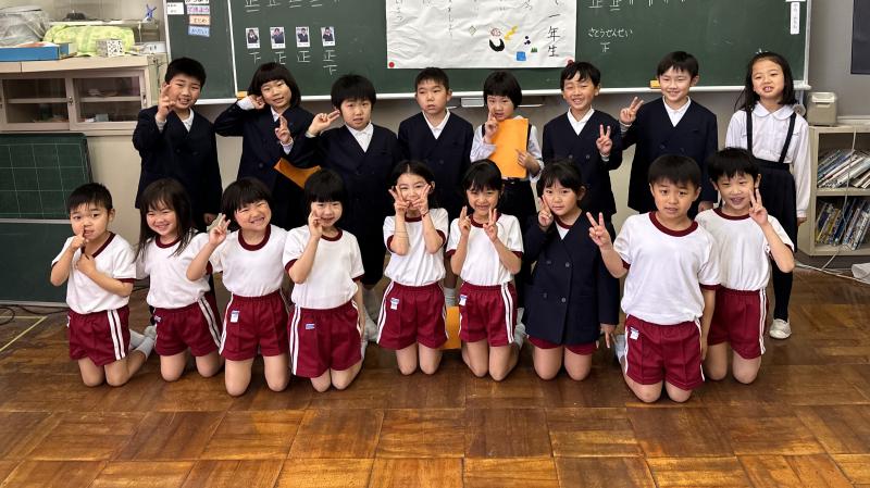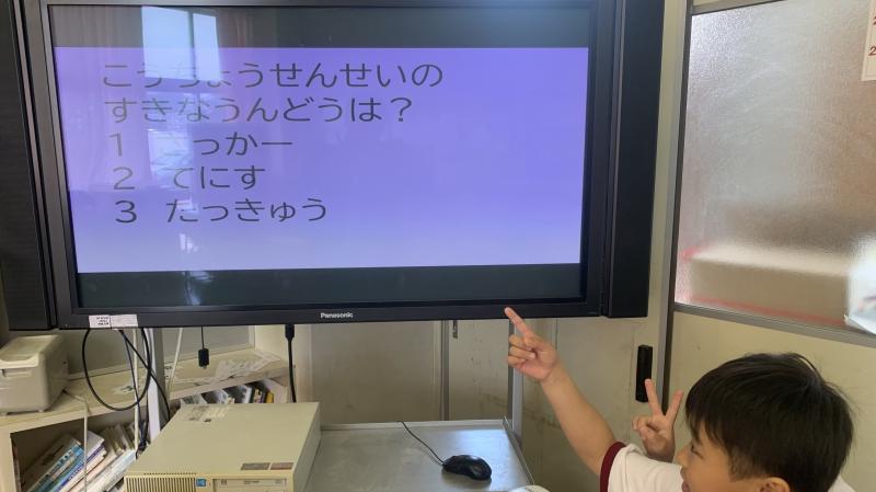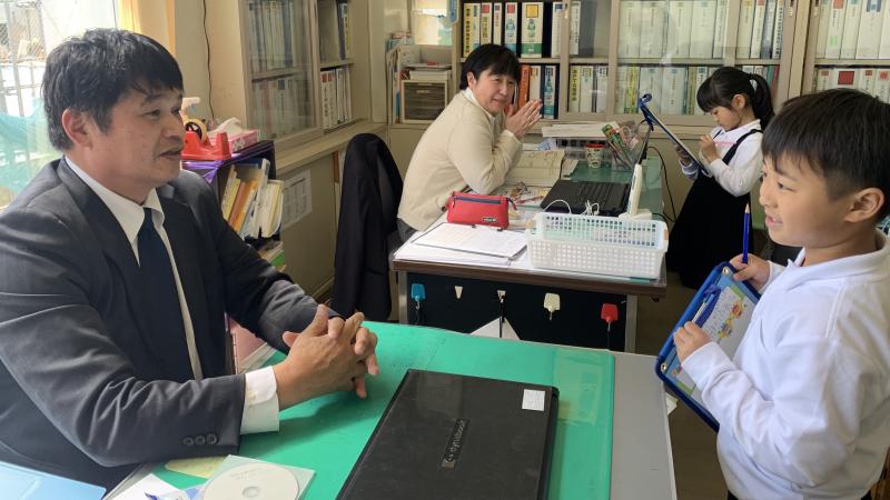 1年生。毎朝元気よく登校しています。黄色い帽子が、とってもよく似合っています。上級生や先生も登校を笑顔で迎えています。また、今日は、職員室の先生に、質問をしに来ました。「好きなスポーツは何ですか」と聞かれた校長先生は「卓球です」と答えていました。どうやらクイズを作っているようです。沢山クイズが出来たかな。