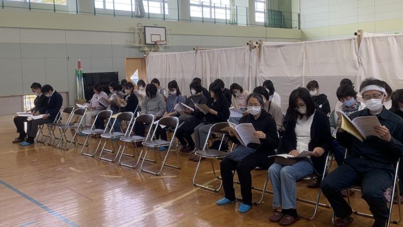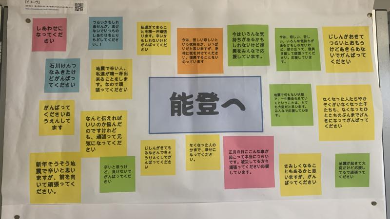 成之坊先生は、いつも保健室前の机に、季節に合わせたお花とメッセージを飾ってくれます。毎回、大変に素敵です。とても有難いです。また、水道が一部復旧したので、歯磨きを行っています。少しずつ日常に近づいています。応援メッセージも届いています。有難い限りです。