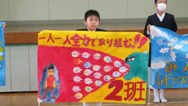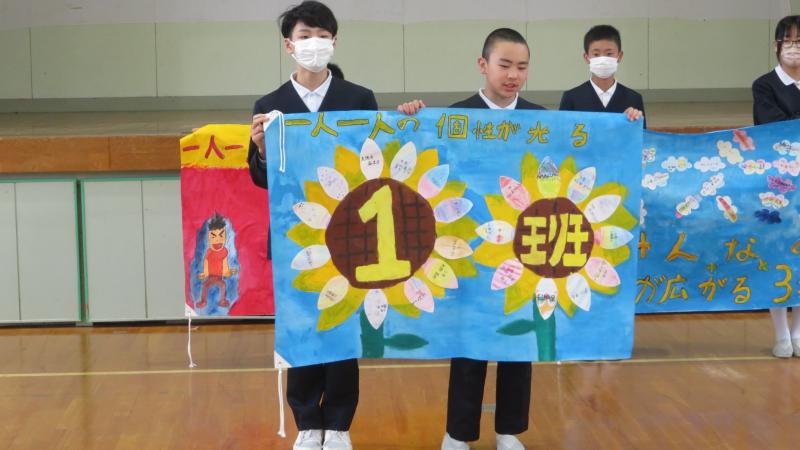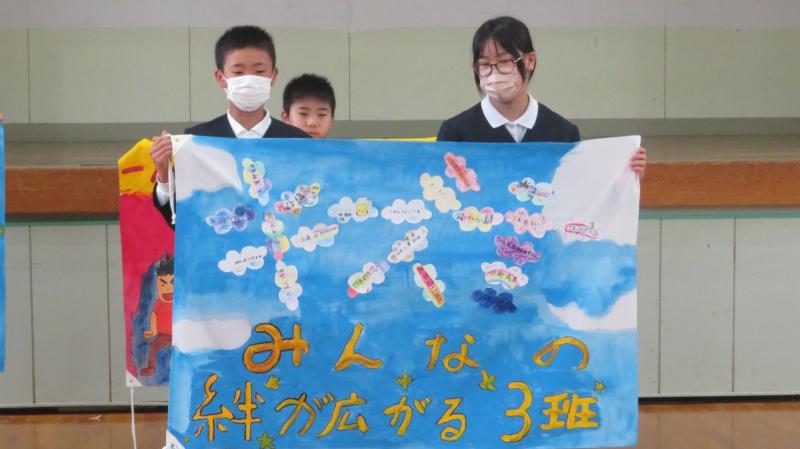 今年度の縦割り班の班旗が完成し、集会で紹介されました。どの旗も、その班の児童の思いがこもっていて、光り輝いていました。(「一人一人の個性が光る(1班)」「一人一人が全力で取り組む(2班)」「みんなの絆が広がる(3班)」)