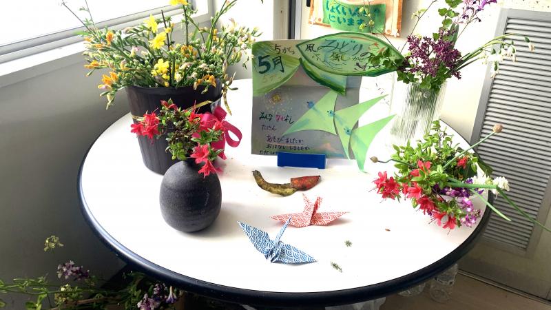 2024年5月7日 18時47分成之坊先生は、いつも保健室前の机に、季節に合わせたお花とメッセージを飾ってくれます。毎回、大変に素敵です。とても有難いです。また、水道が一部復旧したので、歯磨きを行っています。少しずつ日常に近づいています。応援メッセージも届いています。有難い限りです。