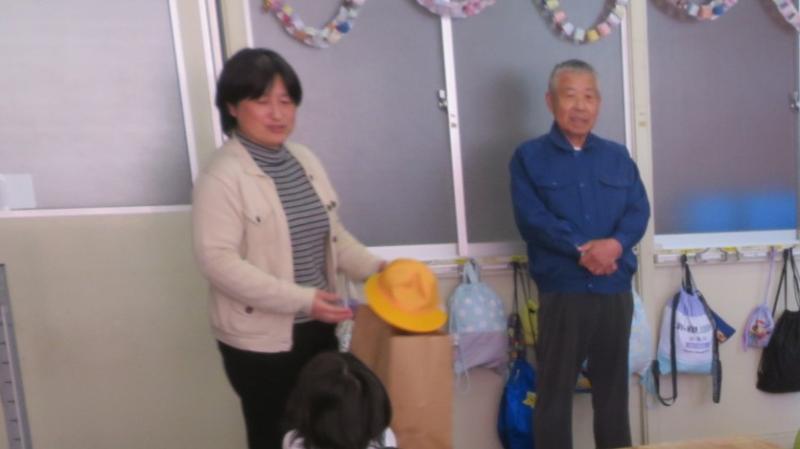 直生会様より、本日、新入生に交通安全帽子をいただきました。会長様より黄色い帽子を一人ずつ被らせてもらって、どの子もとっても嬉しそうでした。これからもずっと、交通安全に気をつけて、安全に通学してほしいと思います。