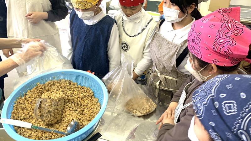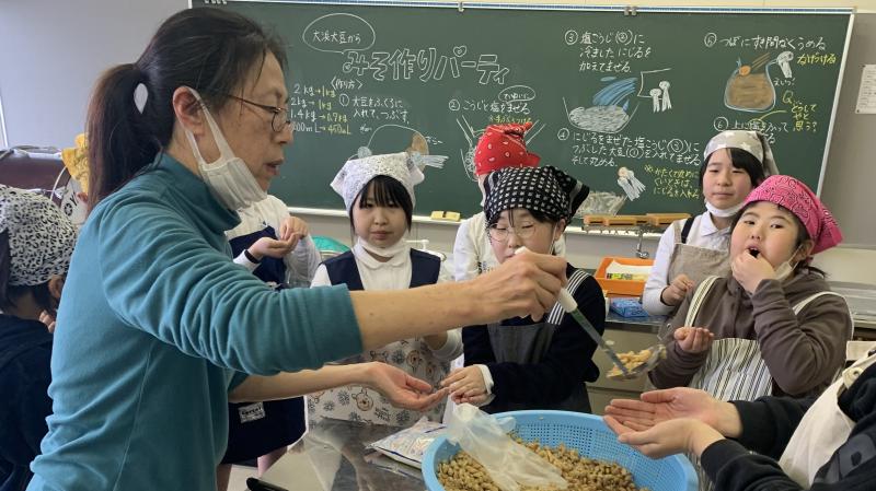 講師の先生をお呼びして、4年生が自分達で育てた大浜大豆を使って、味噌づくりを行いました。柔らかくした大豆を丁寧に潰して、麹等を混ぜました。4年生の思いのこもった味噌。これからきっと素敵な味になっていくことでしょう。