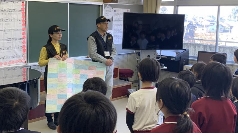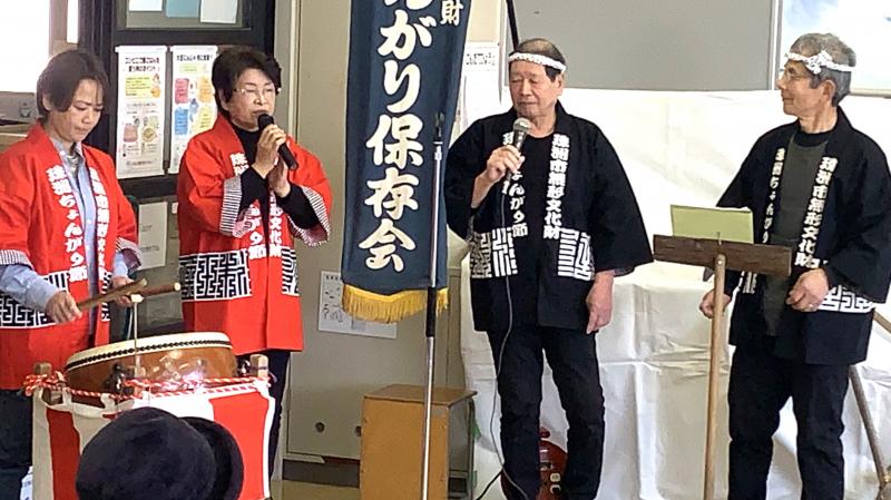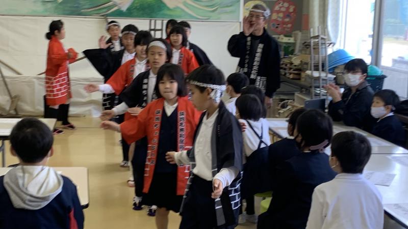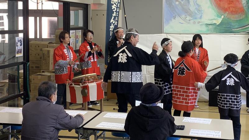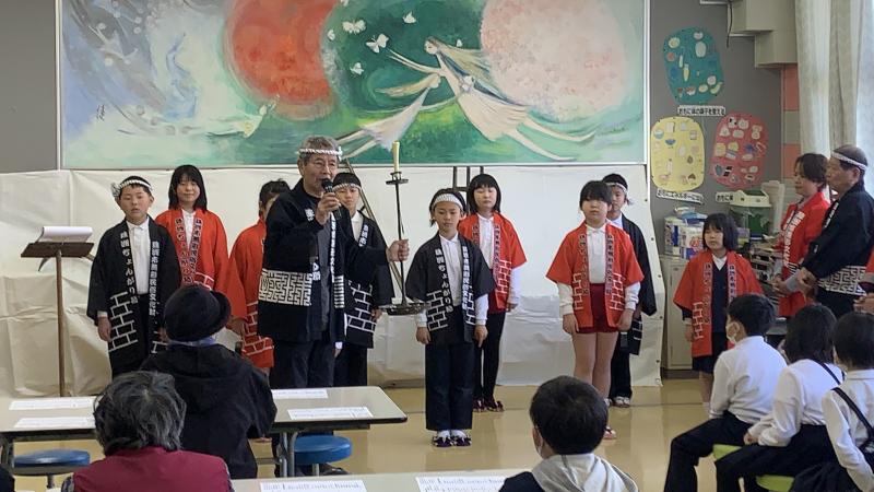 本日、本校で田植え唄やちょんがり節が披露されました。避難所の方々に元気を届けるとともに、保存会の方々に教えていただいて、披露した子供達も元気になりました。メッセージ入りのぼんぼりも飾っていただきました。素敵な伝統を、直小は、これからも元気に受けついでいきたいと思います。