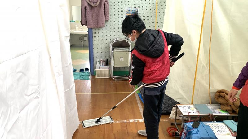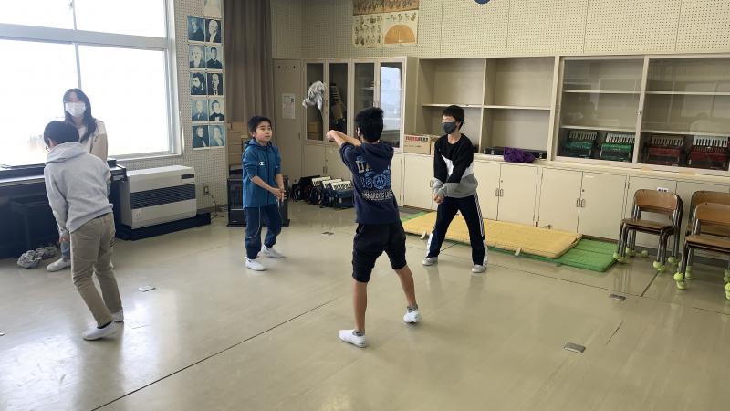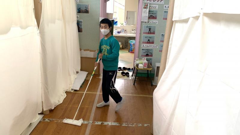 6年生が、避難所の床をモップで綺麗にするお手伝いをしました。自分達で何かやれないかと、相談してはじめたことです。素敵だと思います。3年生は、なわとびの新しい技に挑戦していました。「難しい!」と言いながら楽しそうでした。