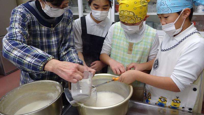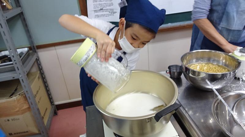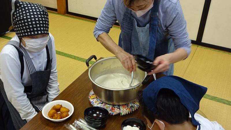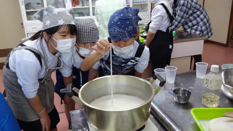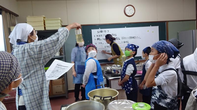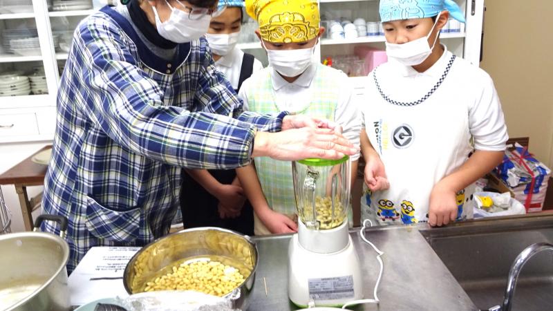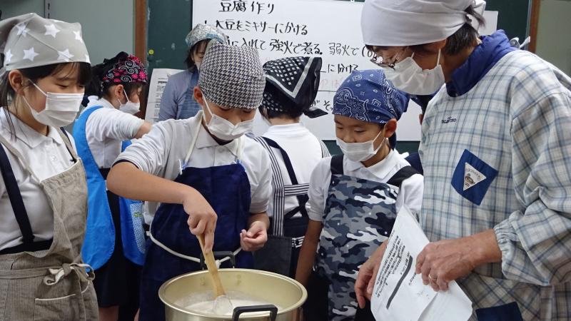 本日、4年生が直公民館様のご協力のもと、豆腐づくりを行いました。ミキサーでつぶした大豆を加熱し、濾し、豆乳をつくり、にがりを入れてかためました。出来上がった豆腐のおいしいこと!おからドーナツもつくっていただき、こちらも大変美味しかったです。とても素敵な体験が出来ました。直公民館様、本当にありがとうございました。