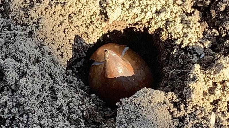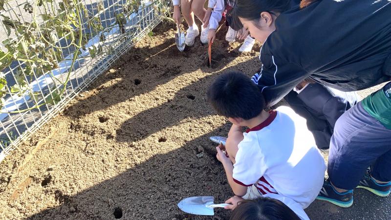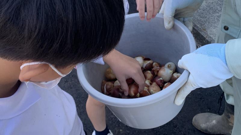 チューリップの球根を植えました。花壇に小さな穴をあけて、そこに1個ずつ球根を入れました。子ども達は1個1個愛おしそうに球根を植えていました。数か月後には芽が出てきます。今から楽しみですね。
