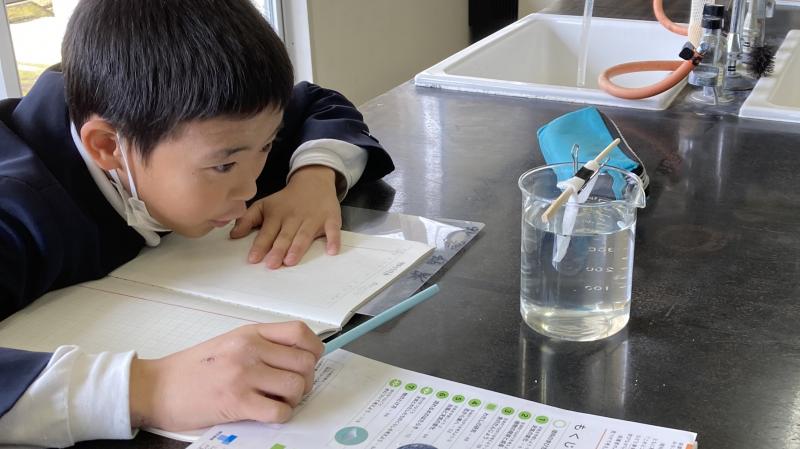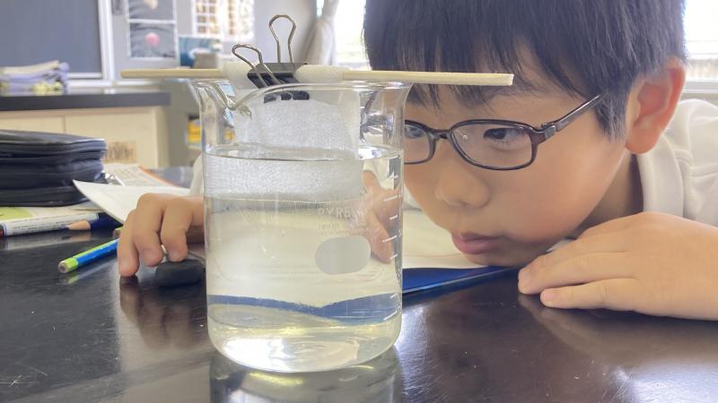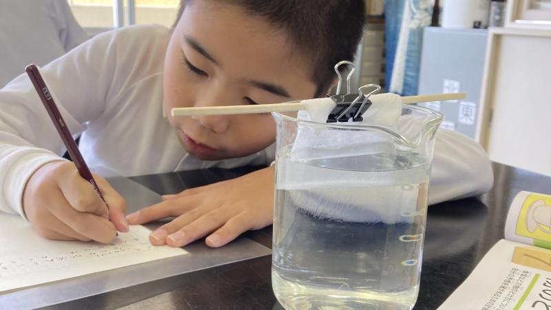 5年生理科で、もの(塩)が水の溶けていく様子を観察しました。紙に包んだ塩が水中にゆっくり溶け出ていく様が、何とも不思議で、興味をそそられるようでした。学習への興味をいだいた時の子ども達の表情はは、本当に素敵です。このような表情をこれからも沢山見たいものです。
