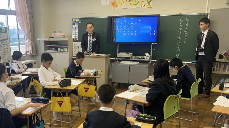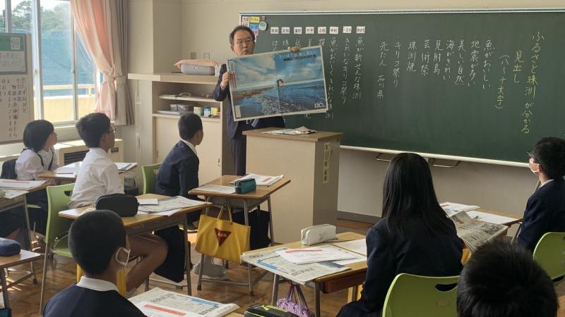 本日、新聞社の方をお招きして、新聞での記事の書き方等を学びました。「見出し」の作り方、「5W1H」等、沢山のポイントを教えていただきました。最後には、「ふるさと珠洲」をテーマに記事にするとしたら、どんな「見出し」がいいかみんなで考えました。いい見出しがいっぱい出ました。素敵な時間となりました。講師の先生、とてもわかりやすく教えていただき、本当にありがとうございました。