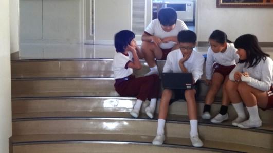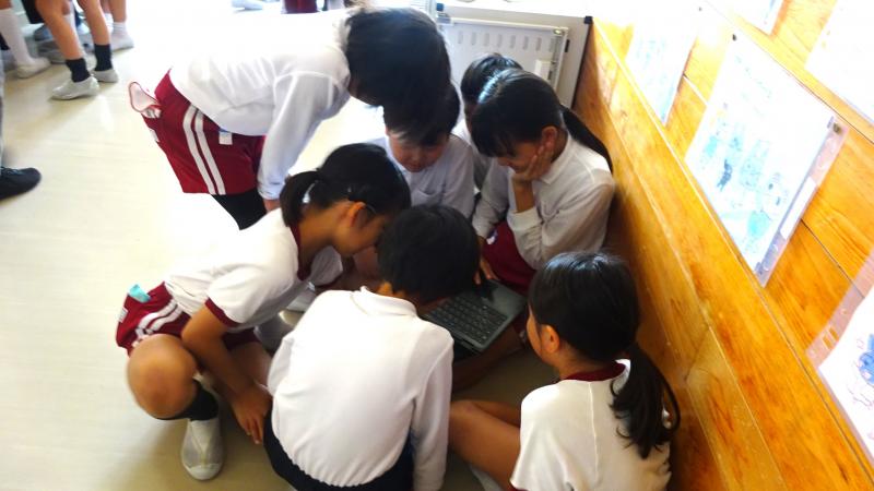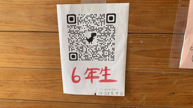 保健委員会の企画です。縦割り班班ごとに、壁に貼られたQRコードを読み込んで、クイズをゲット、答えていくという、くクイズラリーを実施しました。クイズに到達した時やみんなで答えを考えたりする時をはじめ、大盛り上がりでした。