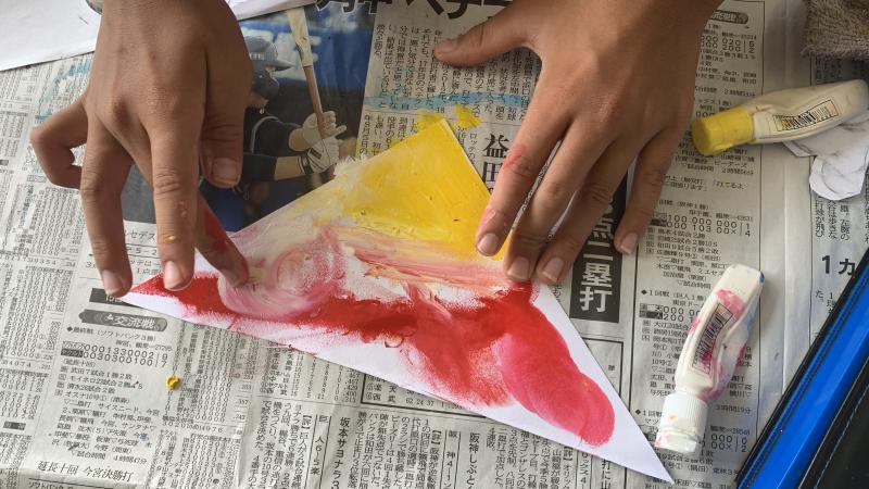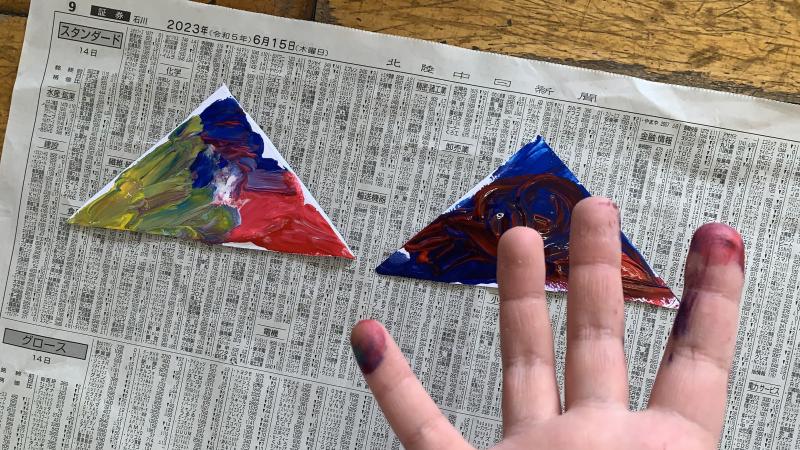4年生の図工です。紙の上に、何色かの絵の具を出し、それを指で混ぜ合わせながら、生まれてくる色、模様を楽しんでいました。同じ色でも、混ぜ方によって、様々な色、模様が生まれます。とても楽しい活動のようでした。