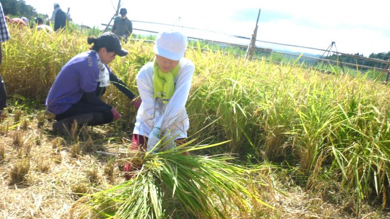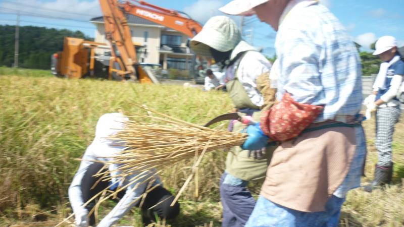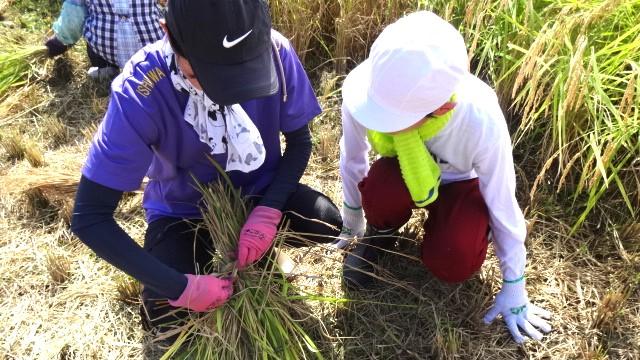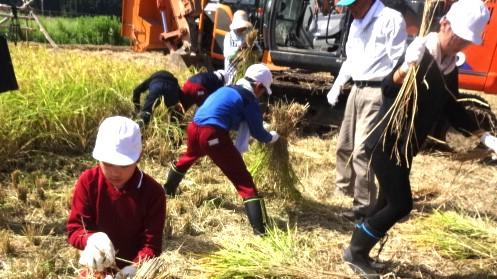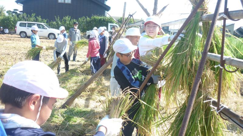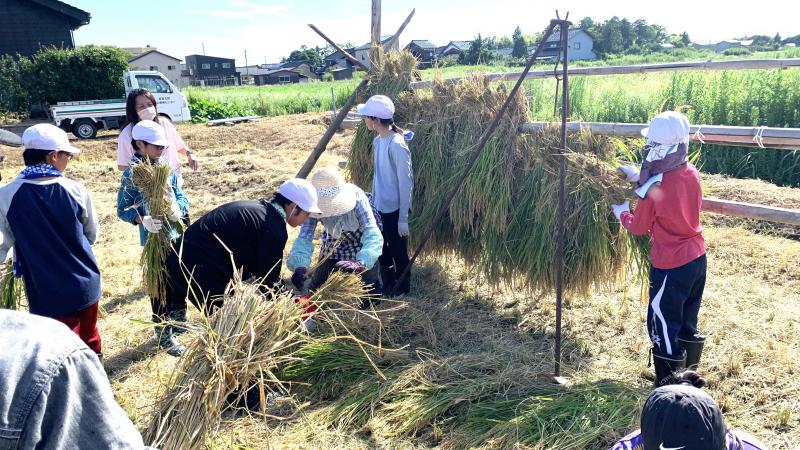 本日、天候にも恵まれ、たわわに実った学校田の稲刈り体験をすることができました。「農事組合法人 きずな」様のご指導、長生会、直公民館様のご協力の下、稲刈りの仕方、縛り方、はざかけを体験しました。下級生たちも応援にきてくれました。刈り取った稲を縛るのに、かなり苦労もしていましたが、どの作業も大変楽しかった」ようです。貴重な体験をさせていただき、お世話いただいた方々に心より感謝申し上げます。