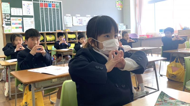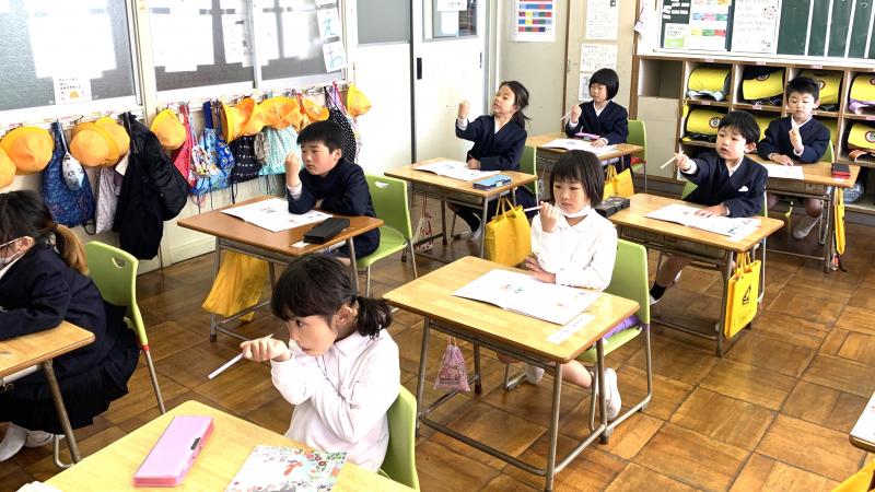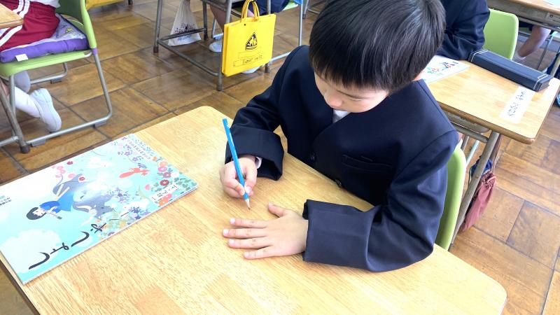 1年生書写。書写体操なるものがあります。ビデオで学習できます。手、指の運動等です。学習の最初に行ったところ、とても楽しそうに取り組んでいました。ビデオによる学習には、その他に「字を書く時の正しい姿勢」「正しい鉛筆の持ち方」もあり、こちらも楽しそうにやっていました。正しい姿勢や鉛筆の持ち方は、とても大事なものです。しっかりと身に付けてほしいと思います。