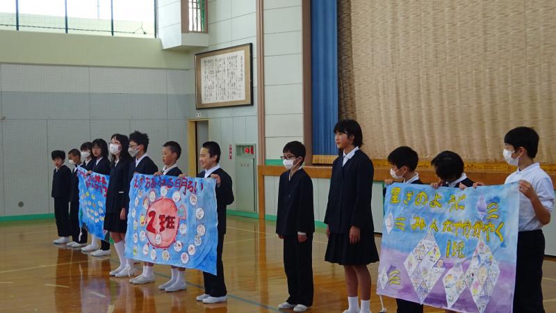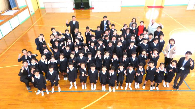 6年生が中心となって、3班それぞれの班旗が出来ました。どの旗も、班の願いがしっかり込められており、児童集会で、その説明もしてくれました。今年1年、この班旗のもとで、それぞれ一致団結して頑張っていくことになります。児童、職員みんなで上からの記念写真も撮りました。これからの活躍が期待できる素敵な表情でした!