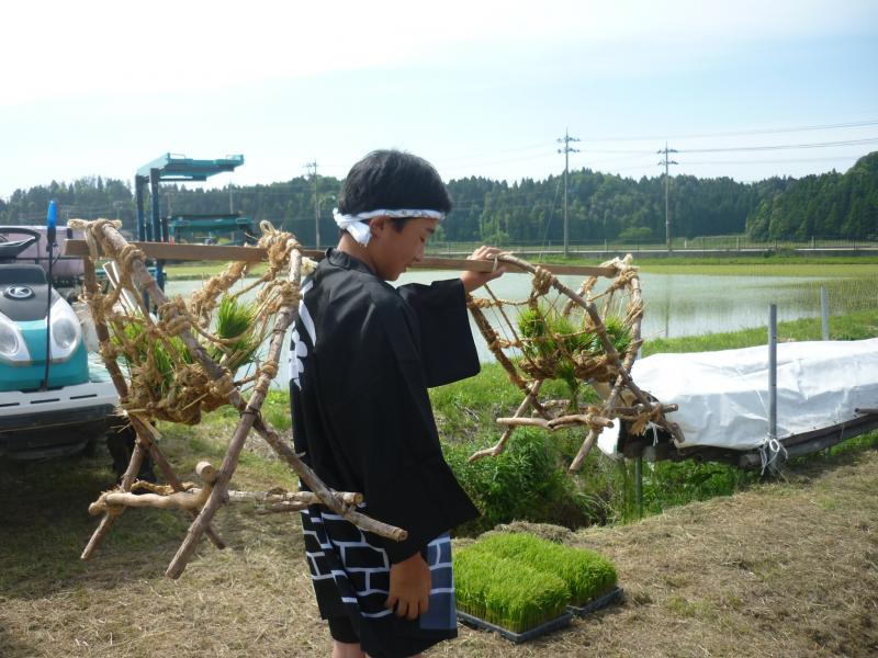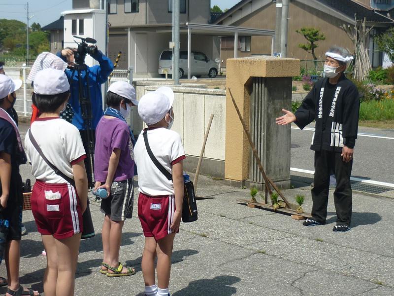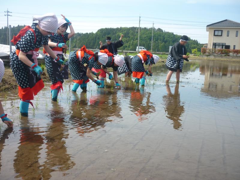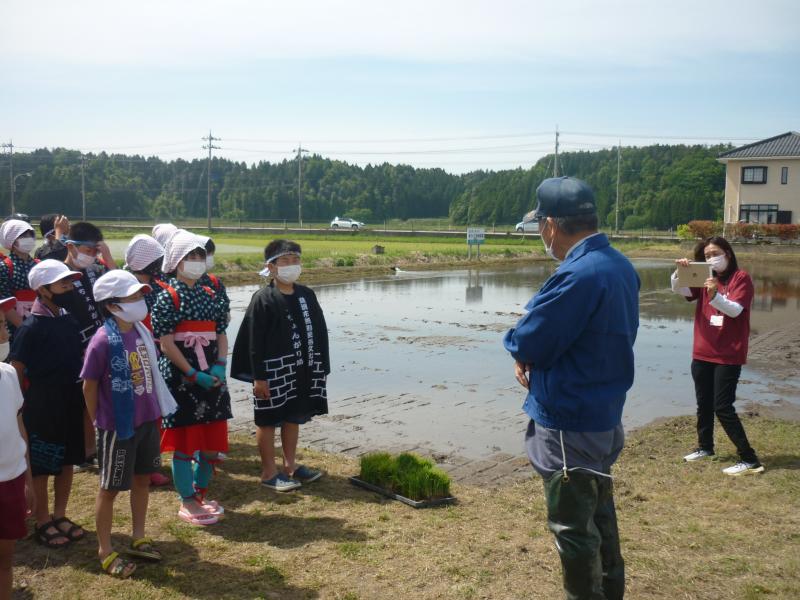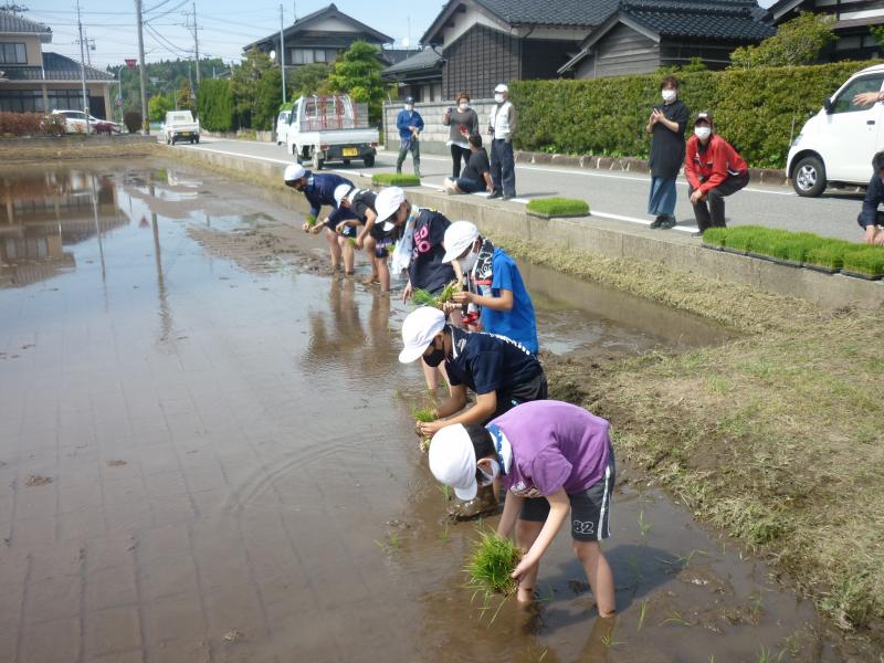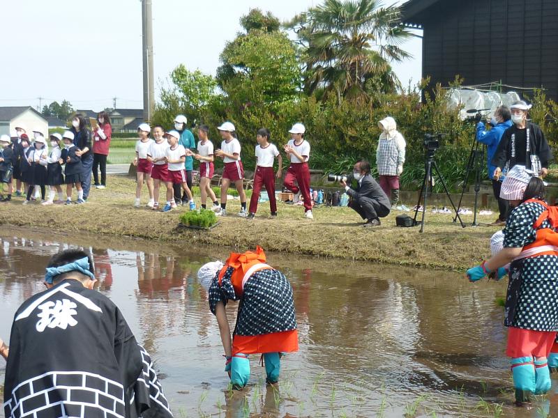 16日(月)午後から田植えを行いました。農事組合法人「きずな」の皆様や、郷土民謡研究会の皆様にご協力いただき、6年生の女子は早乙女の着物を、男子は立ち男の法被を身にまとい、5年生と苗を植えました。4年生は、5・6年生に大きな力を与える、田植え唄を大きな声で歌ってくれました。裸足で田んぼに入り、土の感触や、土のにおい、苗のやわらかさなど、貴重な体験をしました。