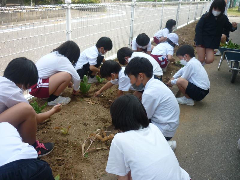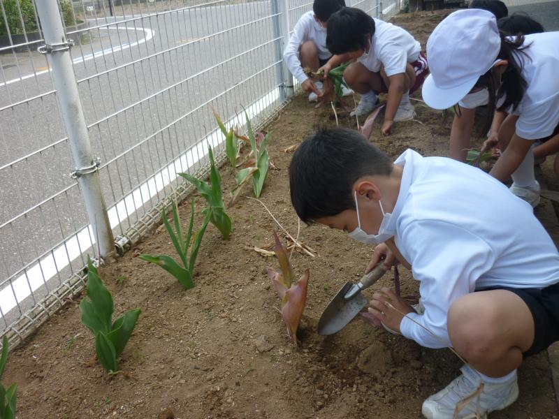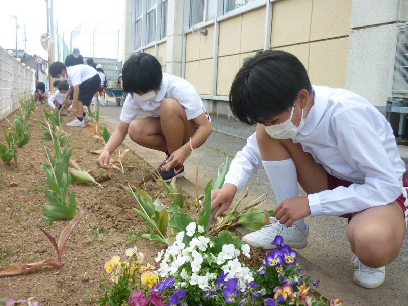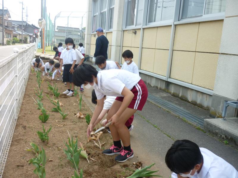 お昼休みにボランティアを募って花壇のチューリップの球根を抜きました。たくさん遊べる昼休みなのに、多くの子ども達が集まって整備してくれました。心が温かくなりました。
