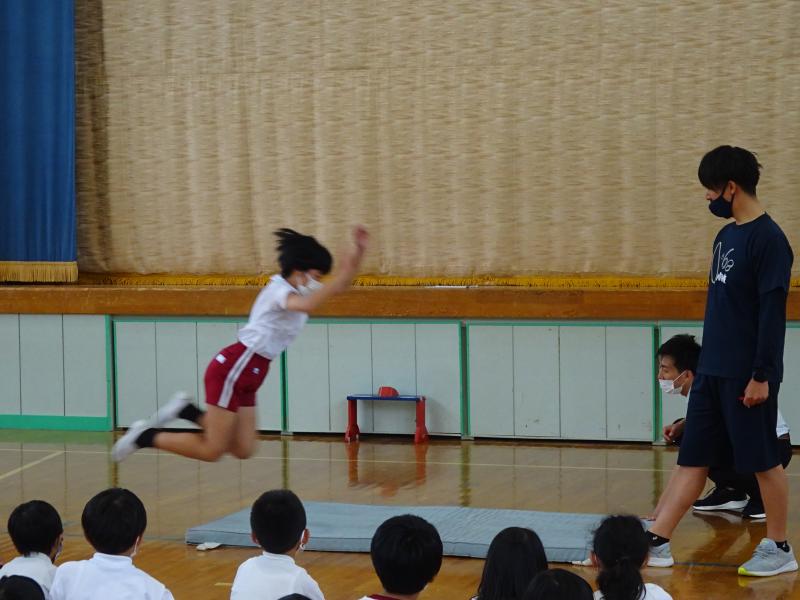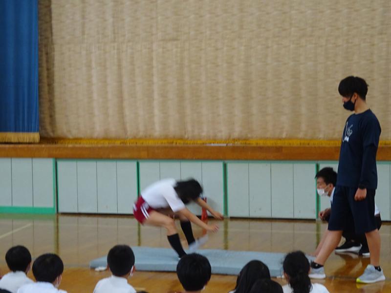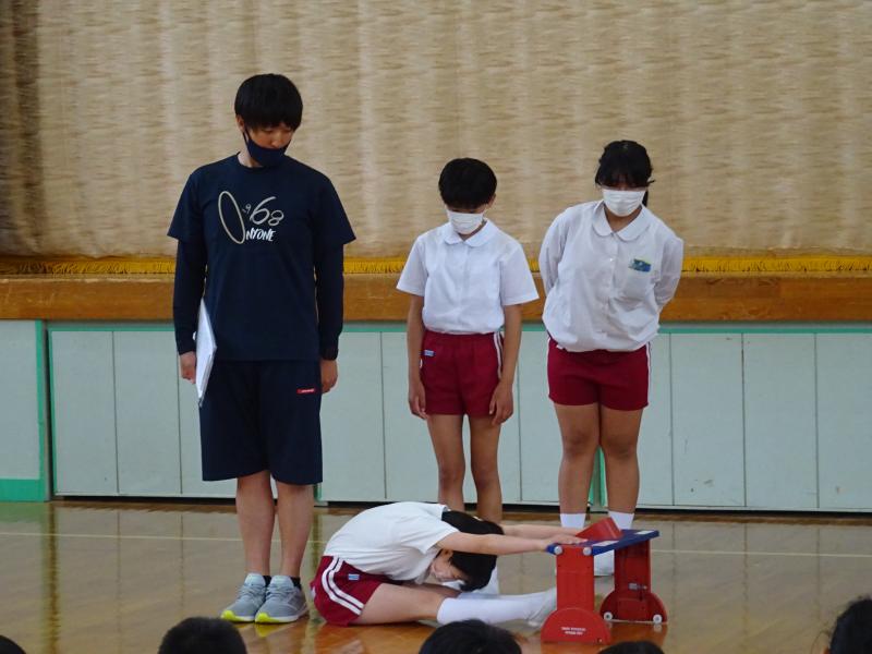 全校朝会で、7日(火)に行う「直っ子オリンピック」の説明がありました。6年生が見本を見せてくれました。7日の本番のイメージがもてました。