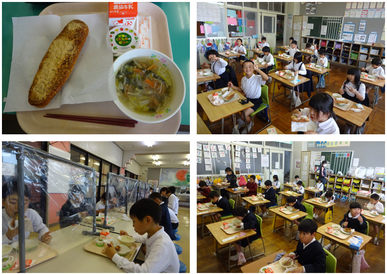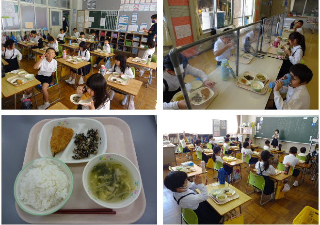 もう朝はだいぶ涼しくなってきましたね。日中はまだ暑いので服装に迷う日々です。 さて、本日の給食は食の大蔵ざらえ3回目でした。献立は きなこ揚げパン 牛乳 鶏団子のスープ(ミートボール) フルーツゼリー(ヤヨイ) で珍しいメニューとなりました。子ども達はとても楽しみにしており、おいしそうに食べていました。揚げパンはインフルエンザでパンが大量に余ってしまい堅くなってしまったパンをどうにか活用しようとして考えられたものだそうです。給食はいろいろな人の力で進化していっていることがわかりますね。 ごちそうさまでした。