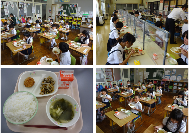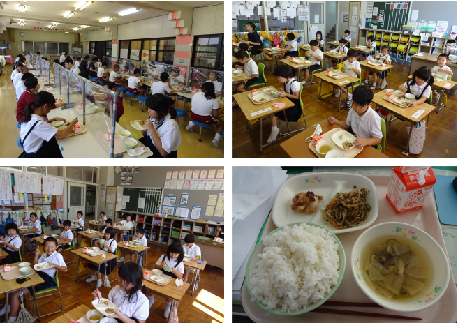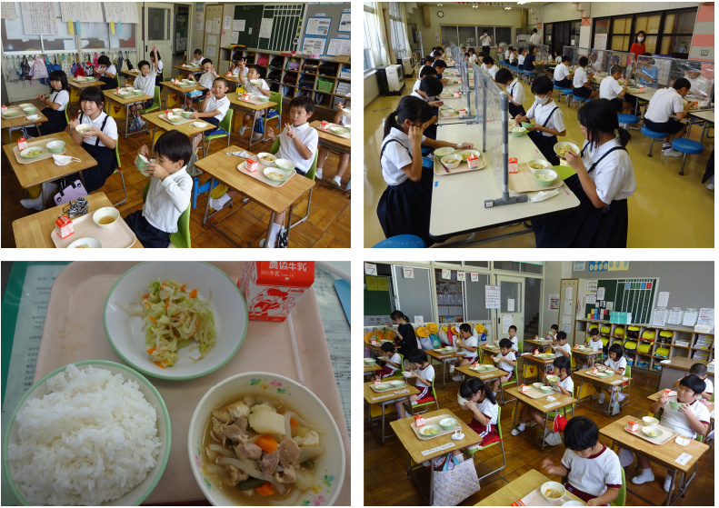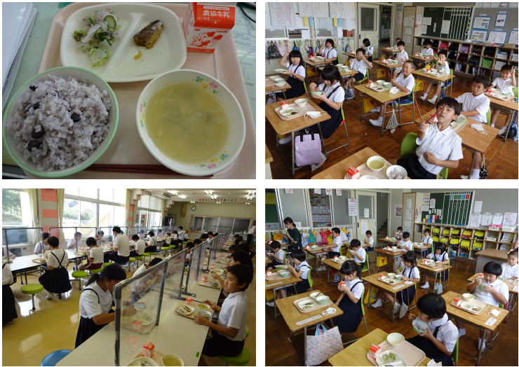 待ちに待った給食がスタートし、あらためてありがたみを感じています。今日の給食は、黒豆ごはん 牛乳 いわしの味噌煮 大根のゆかり和え すりわり汁(呉汁・豆汁) でした。 以前アンケートをとったもので昔ながらの給食らしく、とてもおいしかったです。「食の大蔵ざらえ」とみてどういった給食だろうと考えていましたが、奥能登国際芸術祭で珠洲の大蔵ざらえというキャンペーンを行っており、その内容が「眠ったままの「地域の宝」を思い出や記憶とともに市内一円から集めて整理する地域の一大プロジェクト」と記載してありました。ですので思い出深い昔ながらの給食という意味で「食の大蔵ざらえ」なのかなと考えました。児童はおなかいっぱい食べていました。この光景も夏休み中はみられずさみしかったですが、給食はやはり良いものだなと思います。