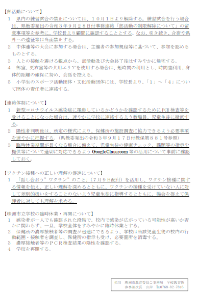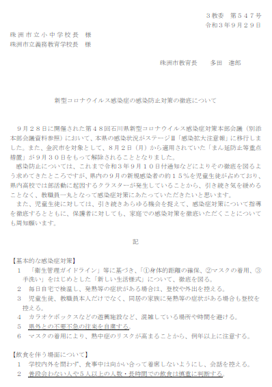 新型コロナウイルス感染症の感染防止対策の徹底について(市教委より)