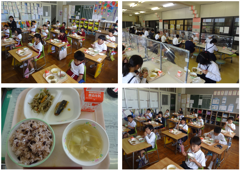 今日の給食は「あずきの日」ということで、 赤飯 牛乳 いわしの味噌煮 かわりきんぴら あぶらあげともやしのみそ汁の献立でした。とてもおいしくいただきました。
