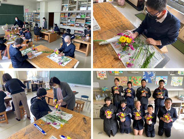 直地区婦人会会長の上野さんと公民館の新出さんに教えていただき,フラワーアレンジメントをしました。卒業式なので,家族への感謝の気持ちを込めて作りました。慎重に,時には大胆に花をあしらっていました。材料は同じでもそれぞれの個性があふれる作品に仕上がりました。