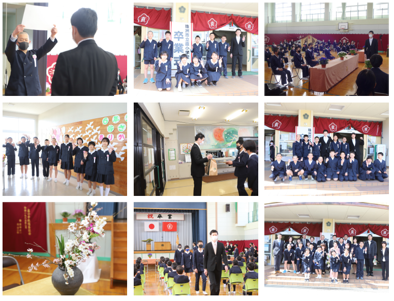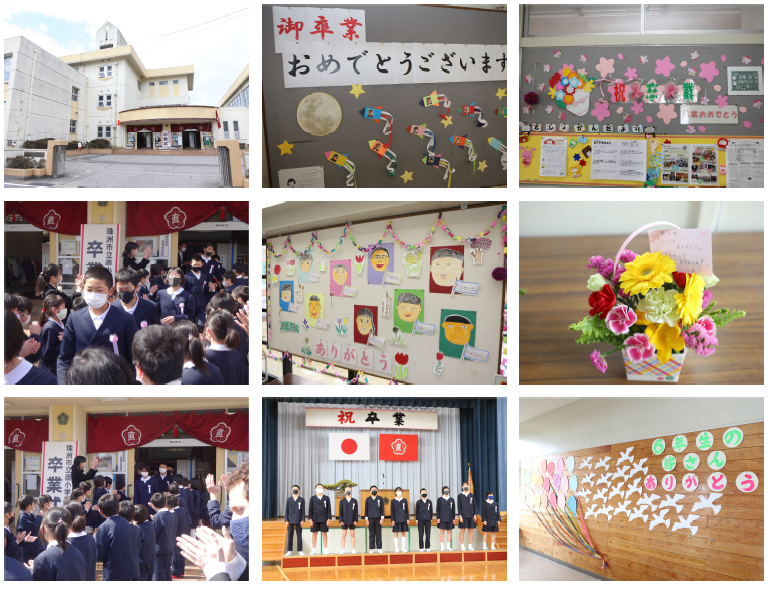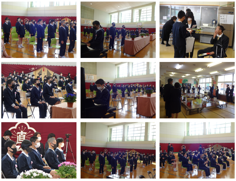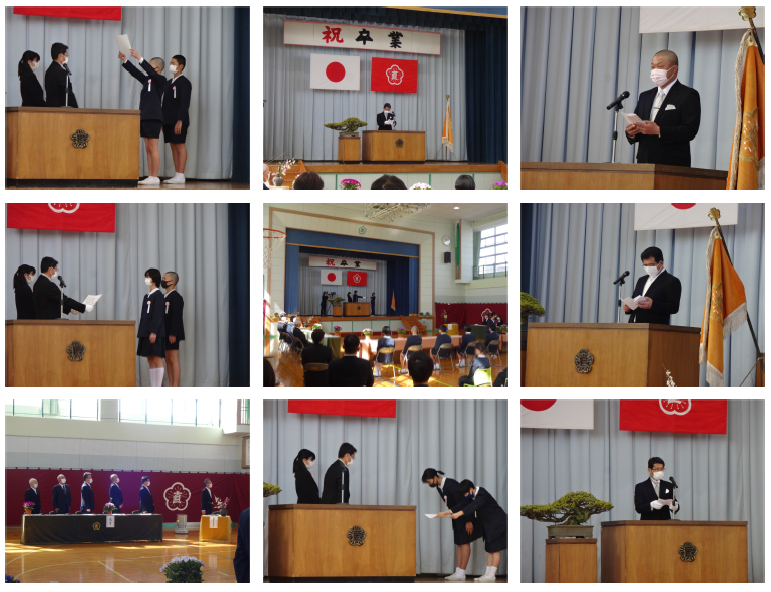 18日の10時より、卒業証書授与式を行いました。コロナ禍のため、来賓を少なくし、1家族2名まででお願いし、感染症対策を実施しての式となりました。式次第については、祝辞等を短くしていただいたり、卒業記念品等の授与を行う等工夫し、52分の式となりました。