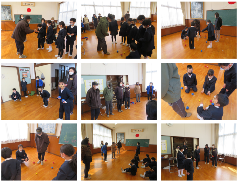 2021年3月11日 10時15分10日の午後、3年生は公民館で長生会の皆さんと、ペタンクで交流しました。長生会の方7名と3年生7名が混合で4チームを作り、総当たり戦で楽しみました。3年生は昨年学級レクでしたことがあったようで、最初は少し自信があったようですが、止めたいところにとまらないことがわかってくると、長生会の皆さんの上手さに感心しているようでした。