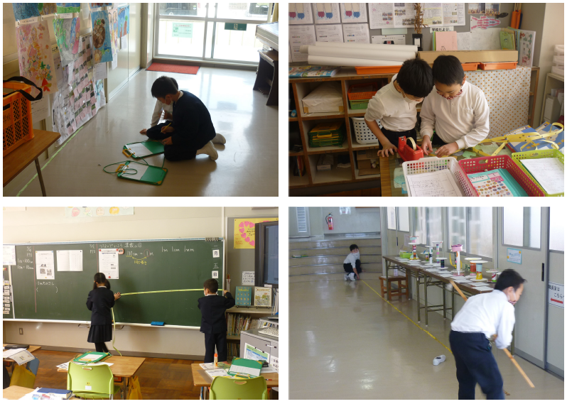 5日の2限、2年生は新しく学んだ長さの単位「m(㍍)」を使って、長いものの長さを調べました。黒板の横の長さや、教室の戸棚の長さなどを測りました。それでも1mものさしの短さを感じた児童は、紙テープで3mものさしを使ったり、最後には巻き尺を使ったりして校舎のいろいろな長さを調べることができました。