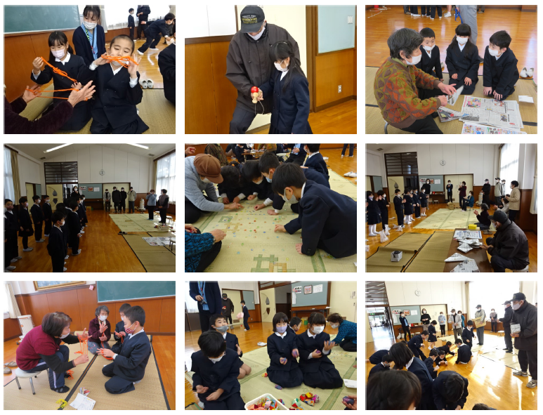 5日の午後、1・2年生は直公民館で昔遊び交流会を行いました。地域のおじいちゃん・おばあちゃんにご協力いただきました。縦割り班に分かれて,けん玉・こま・あやとり・紙鉄砲・お手玉・おはじきの6種類の遊びをしました。子どもたちも聞いたことがある「けん玉」や「コマ」、聞いたことがあるけど遊んだことがない「あやとり」や「おはじき」などいろいろな遊びを体験できました。1年生は初めてのものもあったようですが、上手くできたときはたくさん褒めていただいたり、なかなかできないときにはできるまで優しく教えていただいたりしていました。2年生は1年生の時にもやっているので,昨年よりも上手くできた遊びもあったようです。おじいちゃん・おばあちゃんに教えてもらいながら,1年生と一緒に楽しい時間を過ごすことができました。
