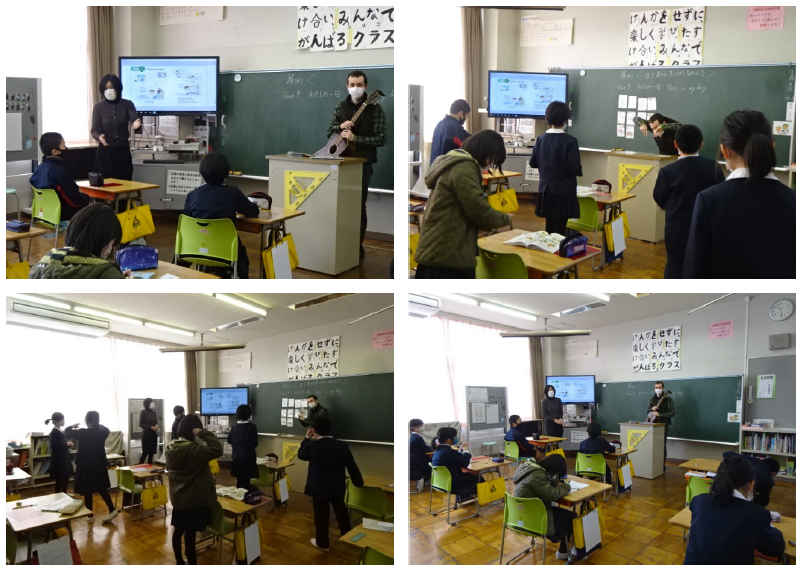 毎週木曜日、ALTマッキー・エイデン先生が来校します。本来なら5・6年外国語の授業に参加されますが、この日は5・6年生がスキーでいなかったため、4年生の外国語活動に参加していただきました。4年生はエイデン先生手作りの動画や生演奏に合わせて、楽しんで英語を学ぶ姿が見られました。エイデン先生ありがとうございました。