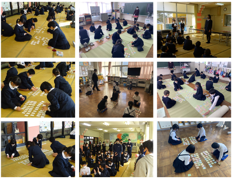 例年、1月の授業参観で行っている百人一首大会。今年度は感染症防止策として密をさけるため、児童及び職員のみで行いました。今年度は、1月に入って校長先生は昼休みに希望者を募り、練習の場も設定して本番を迎えました。会場を1年教室、2・3年教室、なかよしルーム(4~6年生)に分けて行いました。どの会場でも静けさと緊張感の中で、子ども達は耳と目を使い、集中して取り組む姿が見られました。