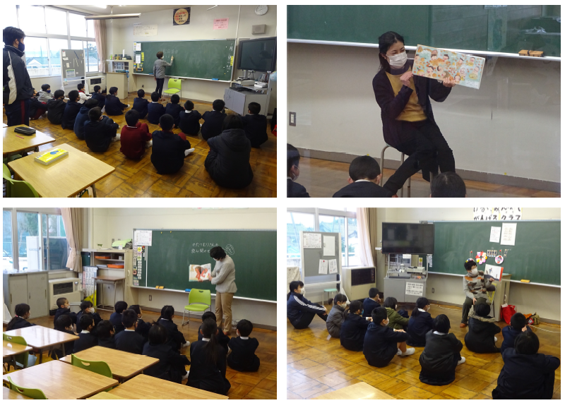 28日の朝は、かたつむりさんによる読み聞かせでした。1年、2・3年、4年、5・6年生の4つに分かれて行っていただきました。