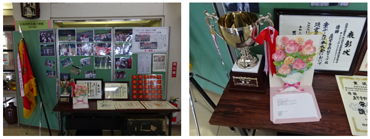 月曜日より、直学童野球クラブが県選抜大会で優勝したことを記念し、学校玄関に展示コーナーを設けました。優勝旗やトロフィー、賞状以外に、写真や新聞記事の掲示、野球部OBの方からの祝電等も展示しています。