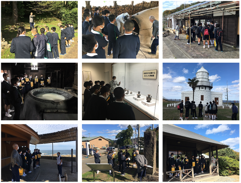 16日、6年生は市内の史跡めぐりに出かけました。例年1学期に行っている活動ですが、今年は2学期となりました。宝立町の西方寺古窯跡から仁江町の奥能登すず塩田村まで、市内をぐるっと一周するように全7カ所を見学しました。