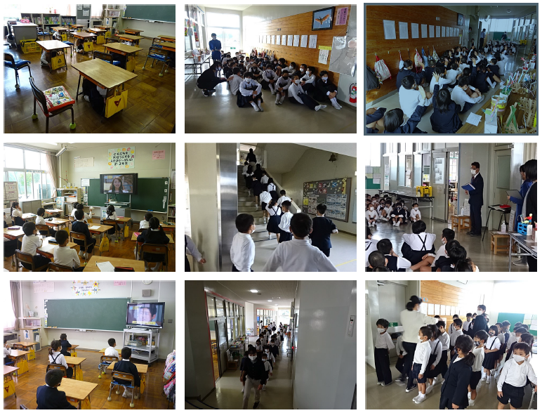 19日の5限目、授業中に地震や津波が発生したことを想定した避難訓練を行いました。緊急地震速報が流れた後、地震が起こった際の音を全校に流し、児童は身を守る行動を行いました。【しゃがむ・かくれる・じっとする】を、自らの判断で行いました。その後は、停電が起こった事を想定し、ハンドマイクで3階廊下へ避難するよう指示しました。児童は、学年ごとに【おさない・かけない・しゃべらない・もどらない】を意識した避難ができていました。