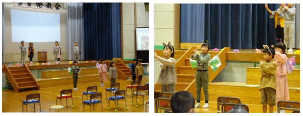 10月24日(土)、学習発表会を開催しました。コロナ渦の中、参観者をご家族等に制限し保護者・職員合唱は行わない等規模を縮小して行いました。それでも児童たちは繰り返し何度も練習し、自分の精一杯を見てもらおうと演じていました。 ◈1年生:劇「あつまれ!おはなしの森」 国語で学習したいろいろなお話を盛り込んだ劇にしました。上級生は1つ1つ懐かしさを感じながら観ることができました。初めての学習発表会でしたが、かわいい動きやはっきりした言い方で、元気いっぱい演じてくれました。
