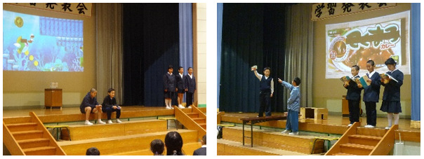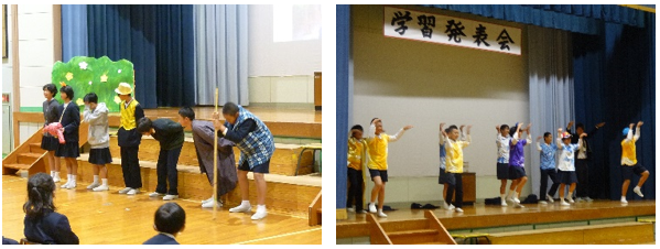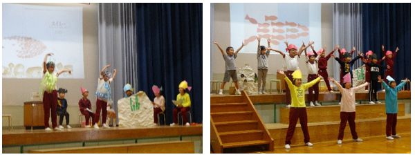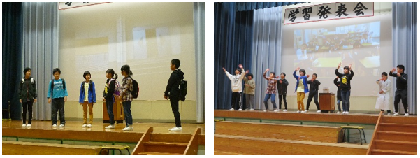 ◈2・3年生:劇「コーラスミュージカル『スイミー』」 2年生が国語科で学んだ『スイミー』。みんながよく知っているお話です。今回はコーラスミュージカルに挑戦しました。どの児童も歌を楽しみながら、大きな声と動きでかわいらしく元気に演技することができました。 ◈4年生:劇「災害~地震が起こったらどうする?~」 4年生は社会科の時間に災害への対応について学習しました。災害はいつ起こるかわかりません。そんな明日に向けて」何ができるかを考え劇にしました。小道具を工夫したりクイズを盛り込んだりして元気に演技ができました。 ◈5年生:劇「カレ-ライス」 国語科で学んだカレーライスのお話をみんなで朗読しながら、主人公である『ひろし』の行動や気持ちを共感しながら観ることができる劇でした。1人1人が役になりきって、自分たちも楽しみながら演じていました。 ◈6年生:劇「新しい未来へ」 テーマ「新しい明日のために」について、6年生はみんなで考え3つの劇にしました。小学校最後の学習発表会、楽しく盛り上げようとダンスも取り入れました。下級生は手拍子をしたり一緒に踊ったりしながら観ることができました。 ◈全校合唱:「小さな勇気」 全校児童での合唱「小さな勇気」。歌の先生・表先生にご指導いただきながら、本校児童の伝統である歌声を、来賓や保護者の皆様に届けようと、何度も練習して本番を迎えました。聞いている皆様の心に熱く届く歌となりました。