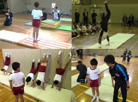 大勢に見られながらするのは,普段ない緊張感がありました。学習会の最後には,発展技に挑戦しました。側方倒立回転や倒立前転などの技を教えてもらいました。他の学校の4年生とも交流することができました。