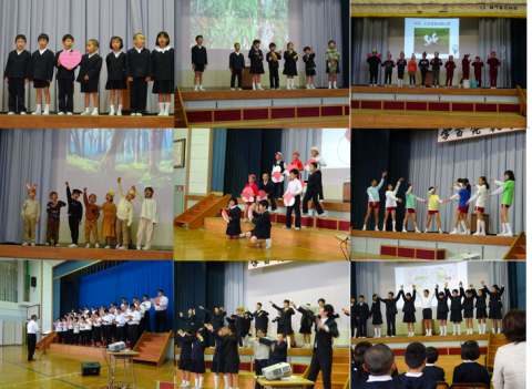 児童の感想より・今日歌を歌い終わった後,すごく達成感がありました。…人間一人一人ちがって同じ人はいないし,完ぺきに物事をこなせるわけではないからこそ,みんなで協力して100%に近づけるように努力した,その成果が今日の結果だと思いました。歌だけでなく劇も一人でやっても全然おもしろくないけれど,協力すれば今日のように10倍も100倍も1000倍もおもしろく変化するのだと思います。だからこそ,人間は仲間と協力して生きていかなければならないと思います。1人の兵士が弱くても束になれば強くなるようにしていきたいと思います。これからは困った時やなやんだ時に友達の力を借りて,協力していこうと思いました。
