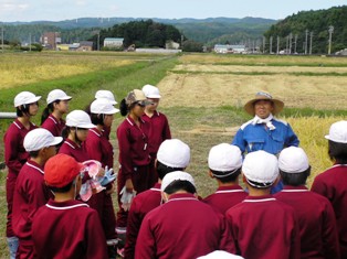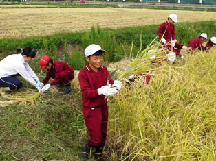 2014年9月22日 12時20分 9月22日(月)に稲刈りをしました。5・6年生が200㎡ほどの面積を鎌で刈りました。