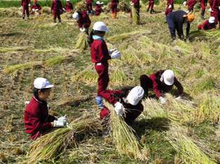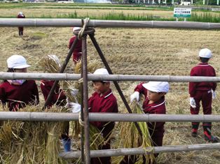 慣れないことなので鎌で手を切らないかと心配しましたが,誰もけがをすることなく無事に稲刈りができました。さすが経験のある6年生は刈るのがとても上手でしたね。でも刈るのは良かったのですが,その後の稲束をわらで縛ることにみんな苦労していました。縛った後は,稲束をはざにかけて干しました。