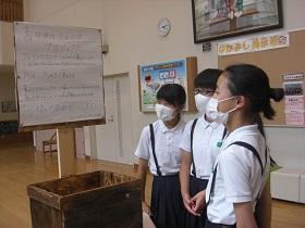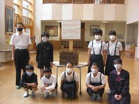 かほく市ボランティアサークルの所属する高松中の生徒が、デイケアサービス事業者が古タオルをぞうきんとしてリサイクルする活動に協力しています。その一環で、高松小学校でも古タオル回収に協力してほしいと、回収ボックスの設置のため、本校を訪れました。近くにいた6年生が代表して回収箱を受取りました。本日、保護者宛案内文を配付しますので、できればご協力をお願いします。