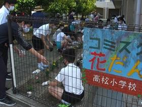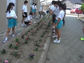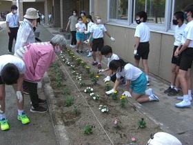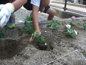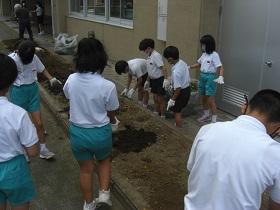 先日掘り起こした花壇に、夏から秋の花の苗を植えました。サルビアやマリーゴールド、日々草などです。地域のフラワーアドバイザーの皆さんに教えていただきながら、子どもたちも参加して植えました。これからどんどん大きくなって花壇いっぱいに花が広がりと思いますので、ご来校の際にはぜひご覧ください。