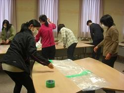 今日は、二ツ屋病院で医療物資の不足が心配されているという報道を聞き、高松中校区の小中学校が連携して、防具服づくりに取り組みました。3校の学校コーディネーターや養護教諭を中心に指導を受け、職員が作業を進めました。この日に高松小では、全部で33着を仕上げることができました。