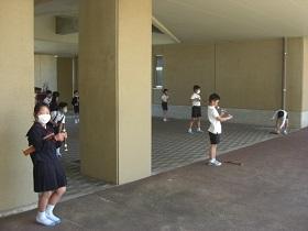 音楽では、外を利用しています。風通しのよいところで、距離を取って、ほんのわずかの時間リコーダーの音出しをしてみました。すぐに布で拭き、手洗いも行いました。ほんのちょっと音が出るだけでも、初めての学年に取っては新鮮な体験だったようです。