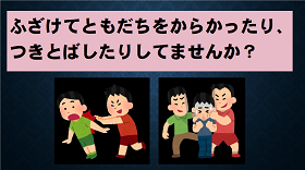本日の学校集会では、スライドを放送で流しながら、「いじめは絶対許されない」という話をしました。軽い気持ちでいじわるをして、相手をいやな気持ちにしていることがいじめであることを、これまでも、またこれからも伝え続けていきます。毎月のアンケートや面談を通して調査、聞き取り、改善に向けた指導、被害者へのケアをしていきます。